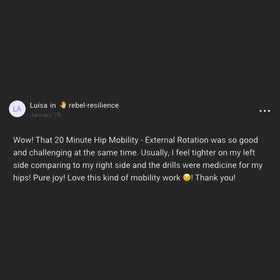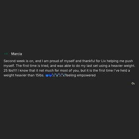 "Liv is a true champion of women's sport, movement and fitness. I have always found her to be knowledgeable, motivating and supportive. She empowers us, listens and is always looking to evolve and improve what she offers. She has helped me to build my own knowledge, flexibility and strength. Thank you, Liv."